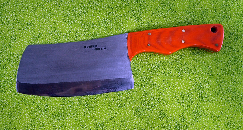 ORDER YOURS TODAY - KITCHEN CLEAVER This heavy duty kitchen cleaver will quickly become the chef’s favorite chopping, slicing and mincing tool. Hand made heavy duty kitchen cleaver made from 1084 steel. 5 ¼ inch blade. 9 ¾ inch overall knife length. Good looking orange G10 handle with brass pins. Whether for a busy restaurant or a home kitchen, this is a high quality, must have tool. This one is SOLD but orders are being accepted. For more information or to place an order, please CALL Rick at 918-695-9240. Please reference knife #2601.